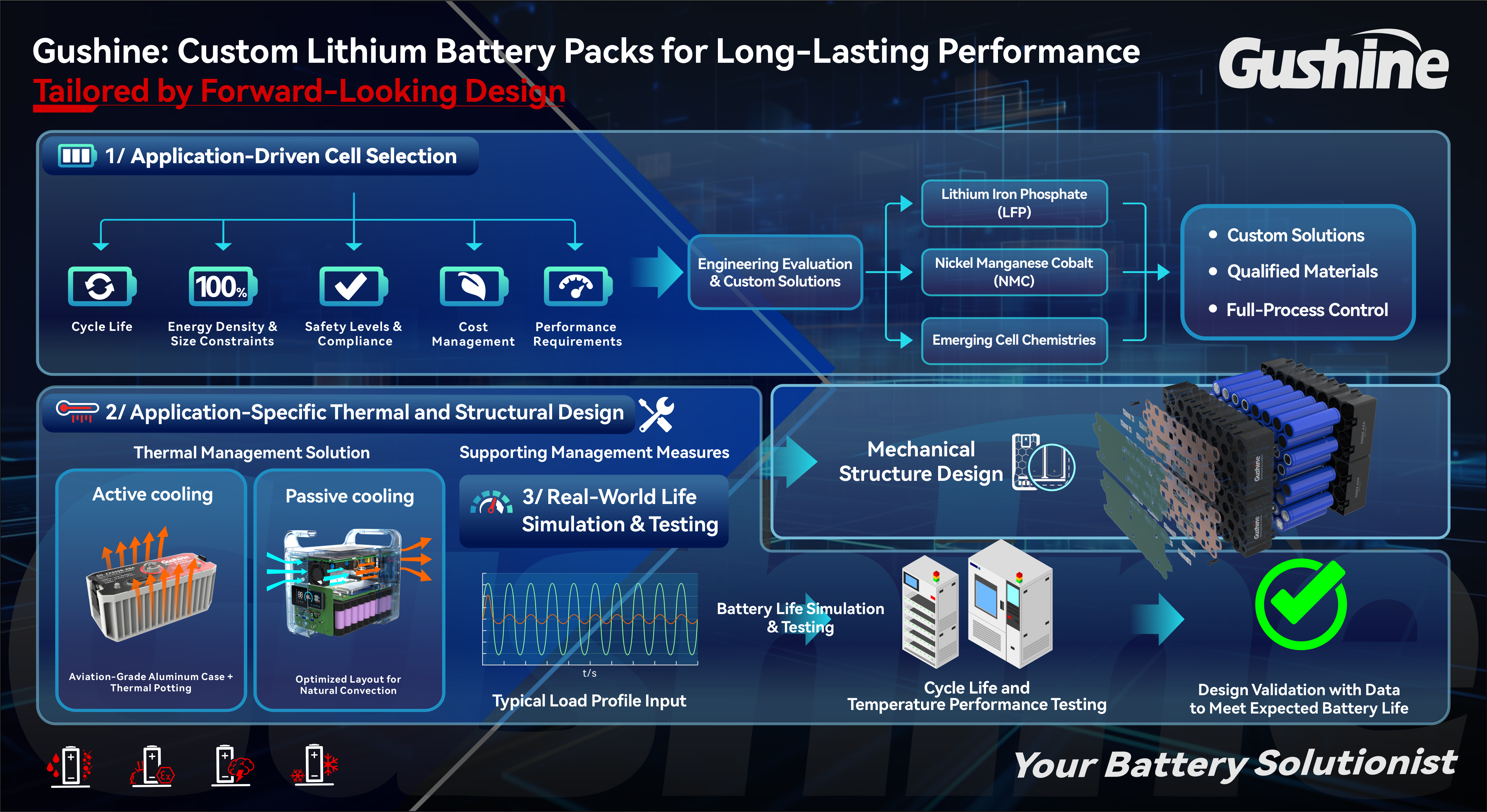 Gushineでは、用途を起点とした設計を重視し、電池寿命を左右する要素を設計段階から織り込んでいます。