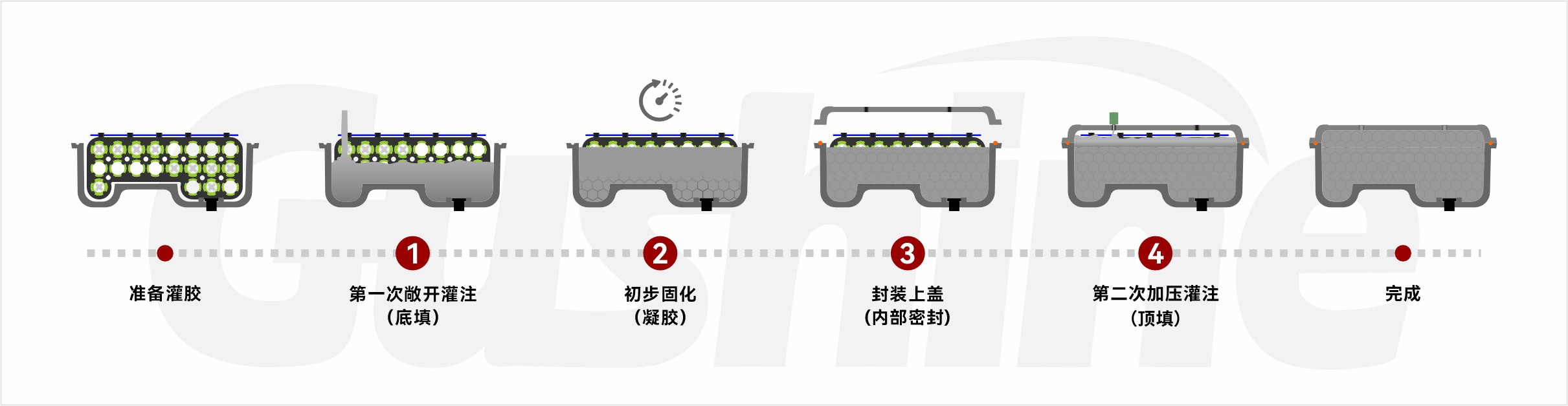 • • 工艺创新:二次灌胶(底填 + 顶填) 古鑫采用敞开灌注(底填)+ 初步固化 + 封装上盖 + 加压灌注(顶填)的双阶段灌胶工艺。